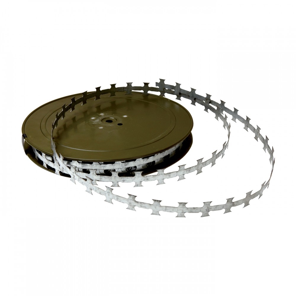 Plochá žiletková páska – šířka pásky 2 cm, balení 50 m, vzdálenost mezi ostny 2,5cm. Slouží jako prvek nejvyšší ochrany.